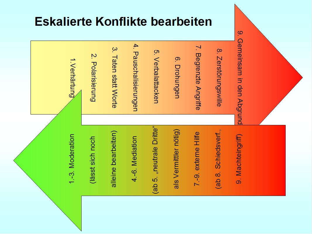 Nur sehr früh in einem Konflikt lässt sich durch das Verhalten der beiden Konfliktparteien eine Lösung finden. Spätestens wenn es um Gesichtsverlust (Öffentlichkeit, Stufe 5) geht, wird eine Deeskalation nur noch mit einer Mediation gelingen.