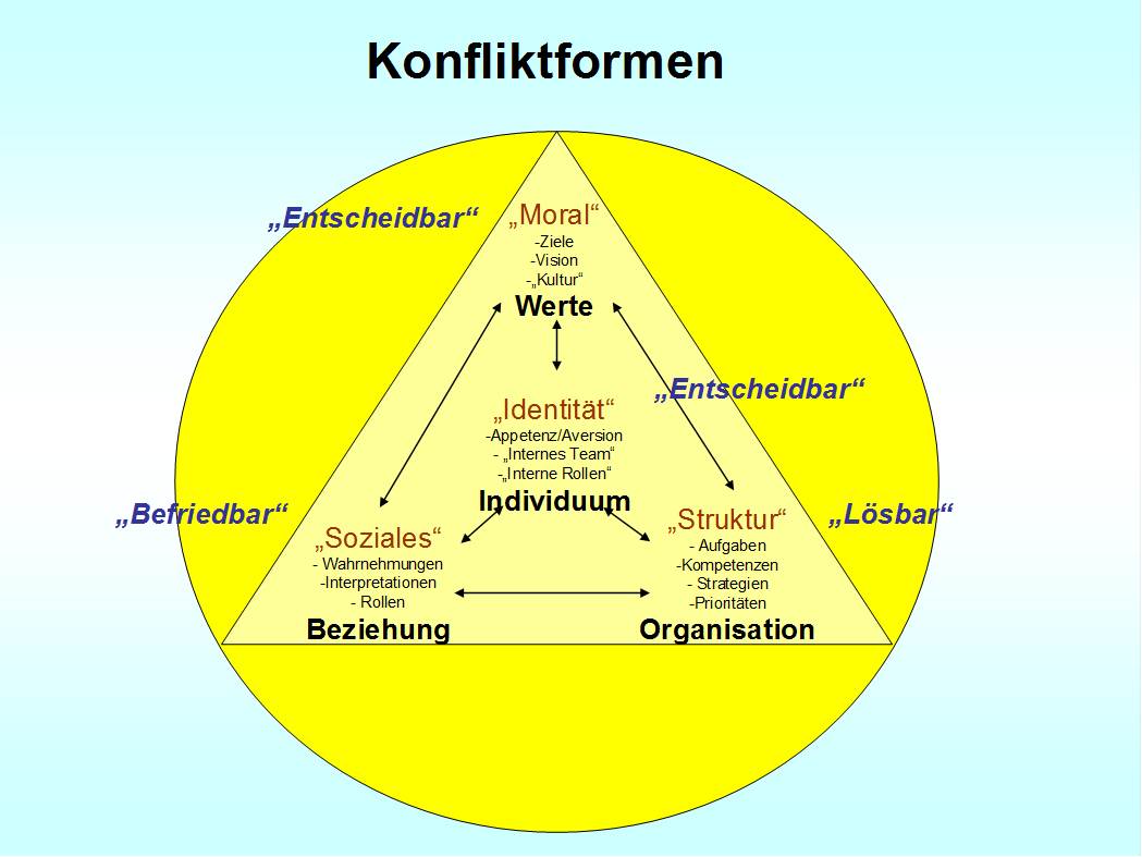 Friedrich Glasl hat die Konfliktformen, die Eskalationsstufen und die dazugehörigen Massnahmen eingängig zusammengefasst:
